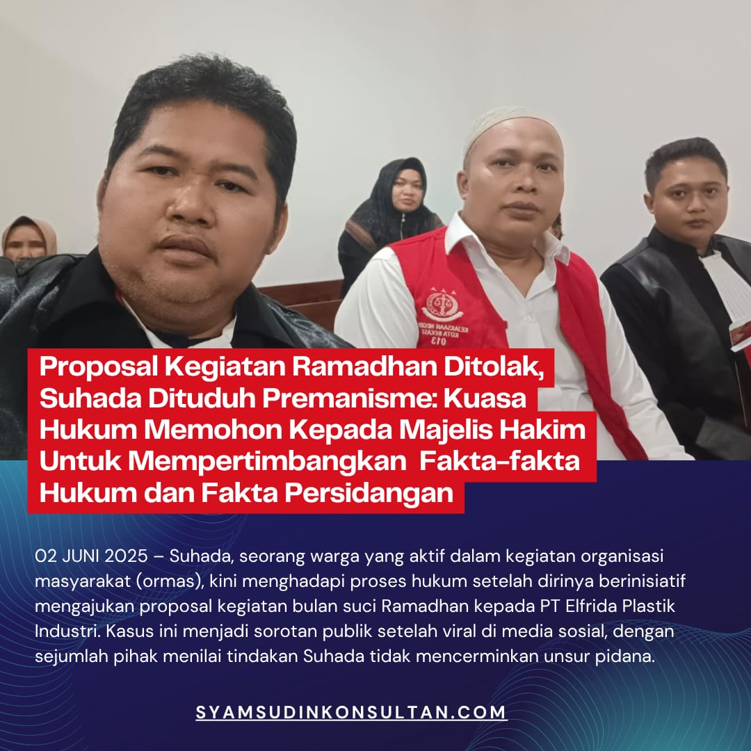 “Tidak ada unsur pemaksaan atau intimidasi. Klien kami hanya ingin tahu alasan penolakan proposal yang ditujukan untuk kepentingan sosial masyarakat. Tuduhan bahwa Suhada adalah preman sangat tidak berdasar dan justru mencemarkan nama baiknya,” ujar Advokat Mohamad Samsodin, S.H.I., M.H. dalam keterangannya di persidangan.